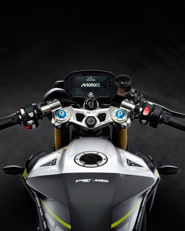 La avanzada configuración de las suspensiones se complementa con un conjunto de componentes inspirados en la competición y diseñados para mejorar la maniobrabilidad y aumentar la confianza del piloto. Los semi-manillares ofrecen una posición más agresiva e inclinada hacia delante para una ergonomía óptima en pista, mientras que las pinzas Brembo Stylema de cuatro pistones, junto con la maneta Brembo MCS ajustable, garantizan una frenada precisa y controlable. Los neumáticos Pirelli Diablo Supercorsa SP V3 de altas prestaciones proporcionan un agarre y una tracción excepcionales como complemento idóneo a un chasis ligero y compacto que logra un peso total en orden de marcha de tan solo 188 kg. Tecnología orientada al motorista Equipadas con un completo paquete de ayudas electrónicas orientadas a ofrecer mayor confianza y control, las nuevas Street Triple 765 RX y Moto2™ Edition incorporan una pantalla TFT a color de 5 pulgadas con una interfaz intuitiva y de fácil lectura. La Moto2™ Edition añade, además, un mensaje de inicio personalizado con el logotipo Moto2™, un detalle que refuerza su vínculo con la competición y acompaña a la tija mecanizada y numerada de cada unidad. Ambos modelos cuentan con una electrónica optimizada que incluye un modo ‘Track’ con una configuración específica del ABS, así como ABS y control de tracción optimizados para curvas, que ajustan su funcionamiento en función del grado de inclinación. De serie incorporan también Triumph Shift Assist, permitiendo subir y bajar marchas sin utilizar el embrague para lograr cambios más rápidos y suaves. En conjunto, estas ayudas ofrecen una experiencia de conducción que combina tecnología derivada de la competición con la practicidad para el uso diario.
